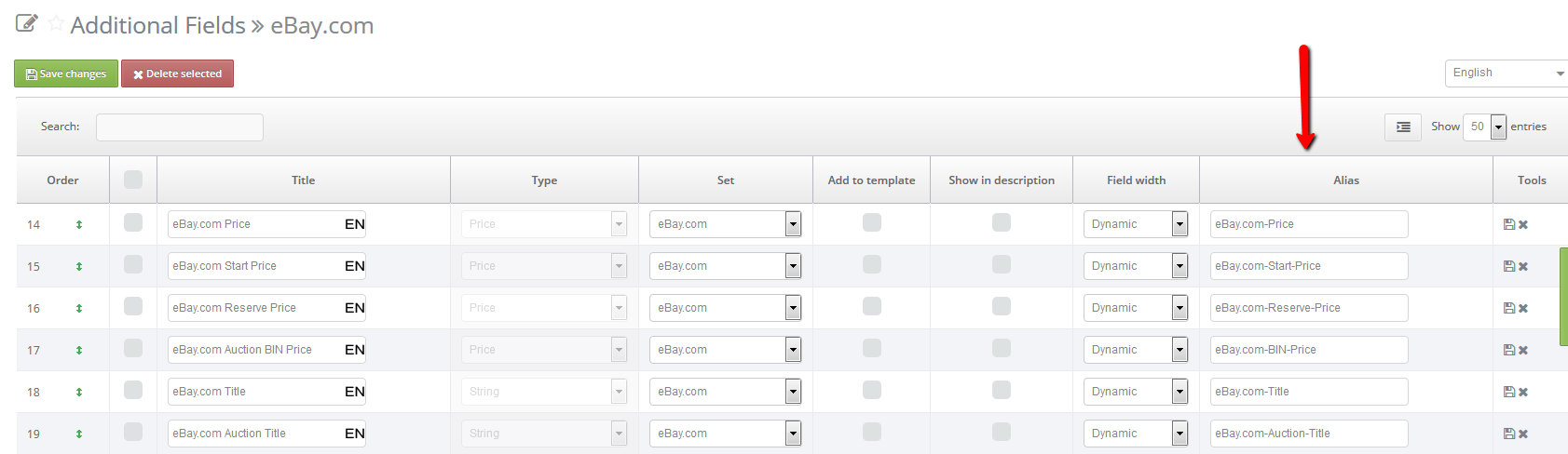 Hashtags names use the product fields Alias (Slug). These are set in Catalog -> Additional fields page.