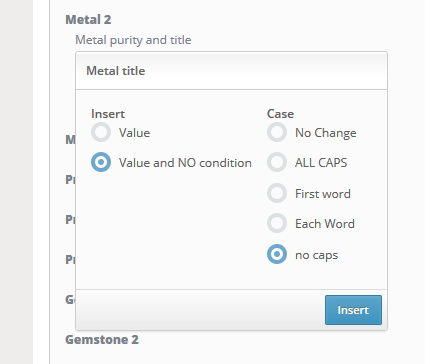 | No Change | exactly as in the field Use: when exact value is require Example: White Gold |