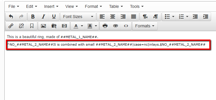 Result - Product 1: | This is a beautiful ring, made of White Gold. * Product 1 has no Metal 2, therefore no Metal 2 Name value The whole text in the condition ^NO_##METAL_2_NAME##...............$NO_##METAL_2_NAME## is removed, including the parameter and the plain text. |