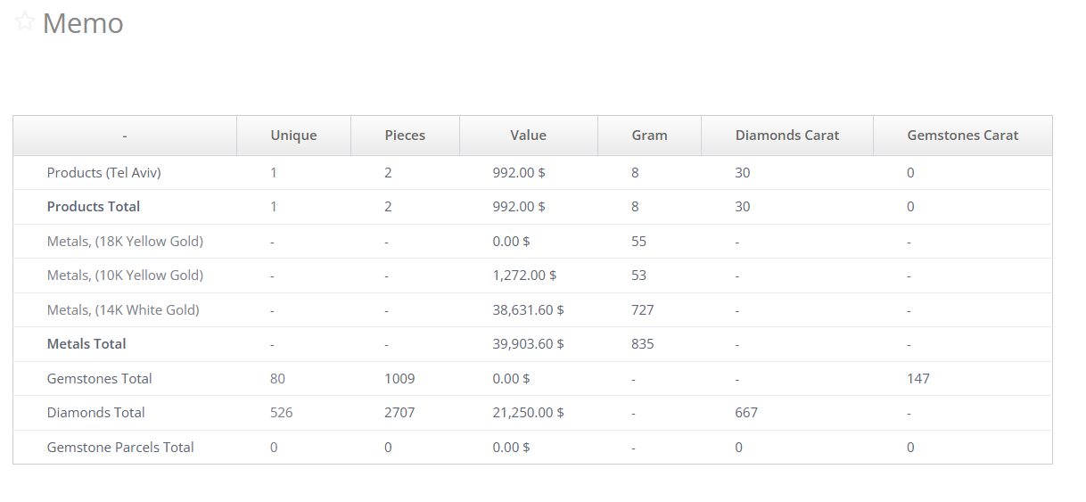 The Memo Out functionality helps track jewelry and loose gemstones that are temporarily moved out of stock for external presentation - such as being sent to potential buyers, clients, or partner stores without finalizing a sale. The Consignment agreement allows handling such cases effectively, and reflect correctly the inventory movement.